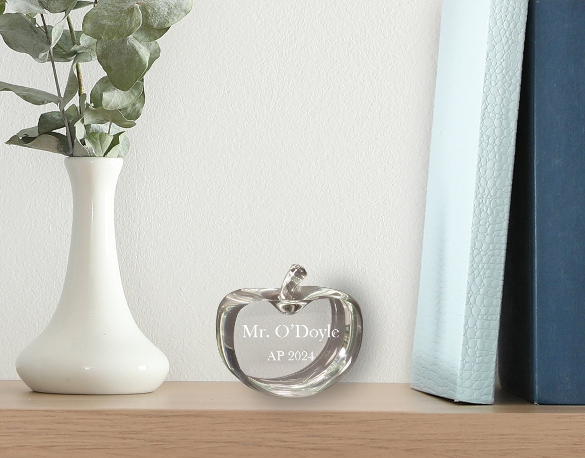 Present a meaningful token of appreciation with this elegant 3.75-inch flat crystal apple paperweight. This luxury item can be custom engraved, making it an ideal personalized gift to recognize outstanding teachers, dedicated staff, or school achievements. Its clear, polished design adds a sophisticated touch to any desk or display, serving as a lasting reminder of special recognition and dedication. The precisely engraved details ensure a distinguished presentation, perfect for celebrating milestones and showing gratitude within educational settings.