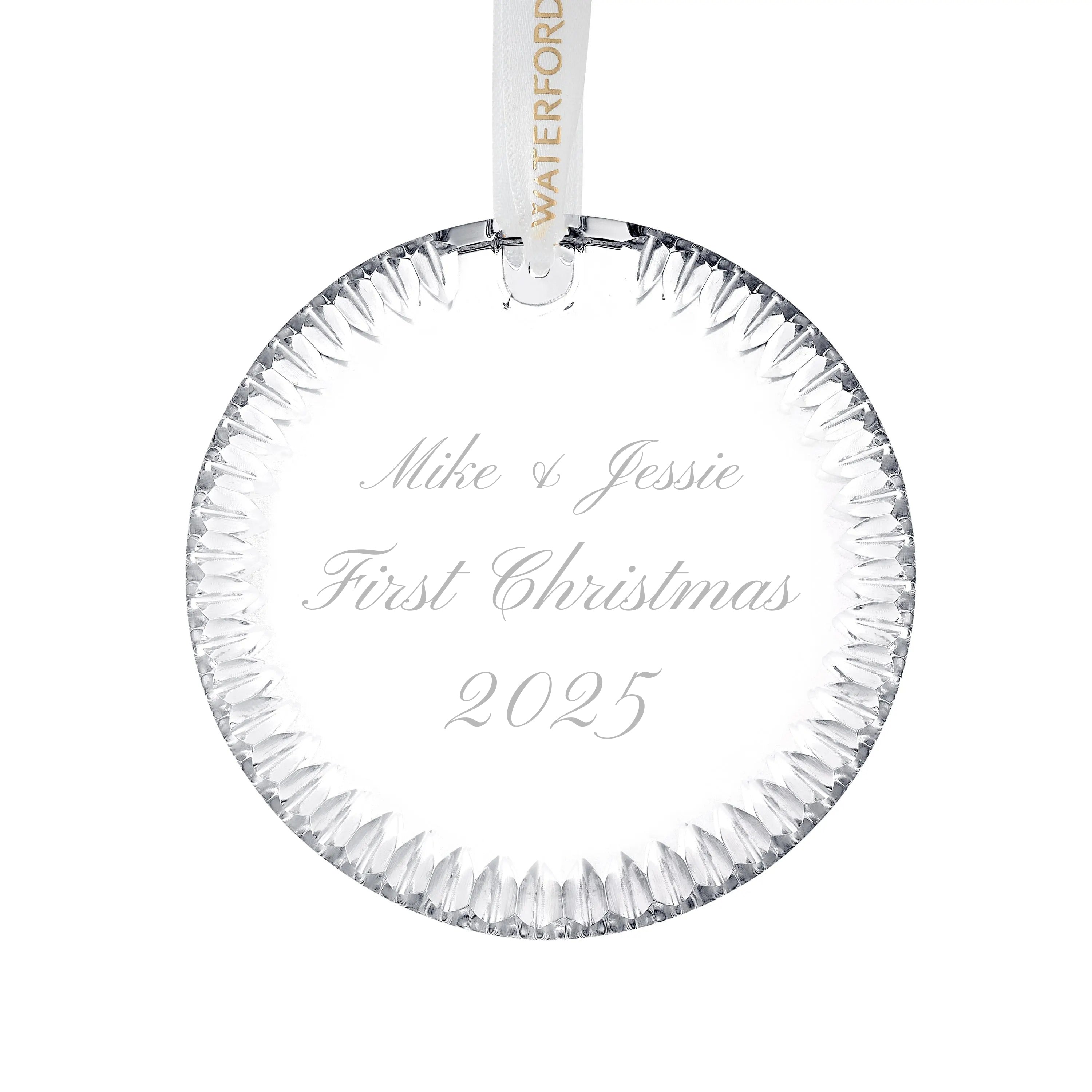 The Waterford Personalized Round Disc Ornament is a timeless crystal keepsake designed to celebrate life’s most meaningful moments. Featuring a beautifully faceted outer border that captures and reflects holiday light, this elegant ornament frames a smooth, polished center that highlights Waterford’s exceptional clarity and craftsmanship. Its classic circular design makes it a refined addition to any Christmas tree, garland, or seasonal display, blending tradition with understated luxury.