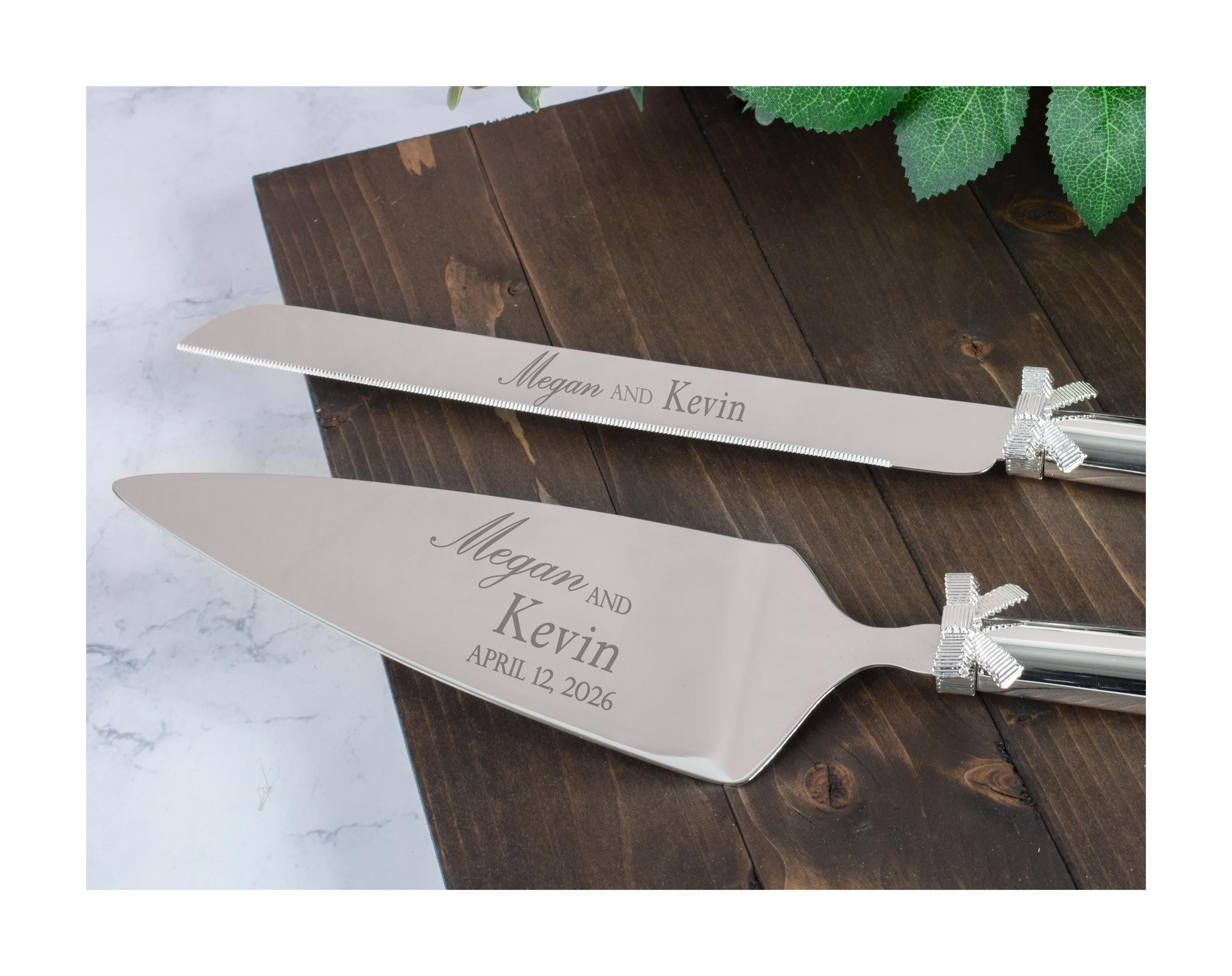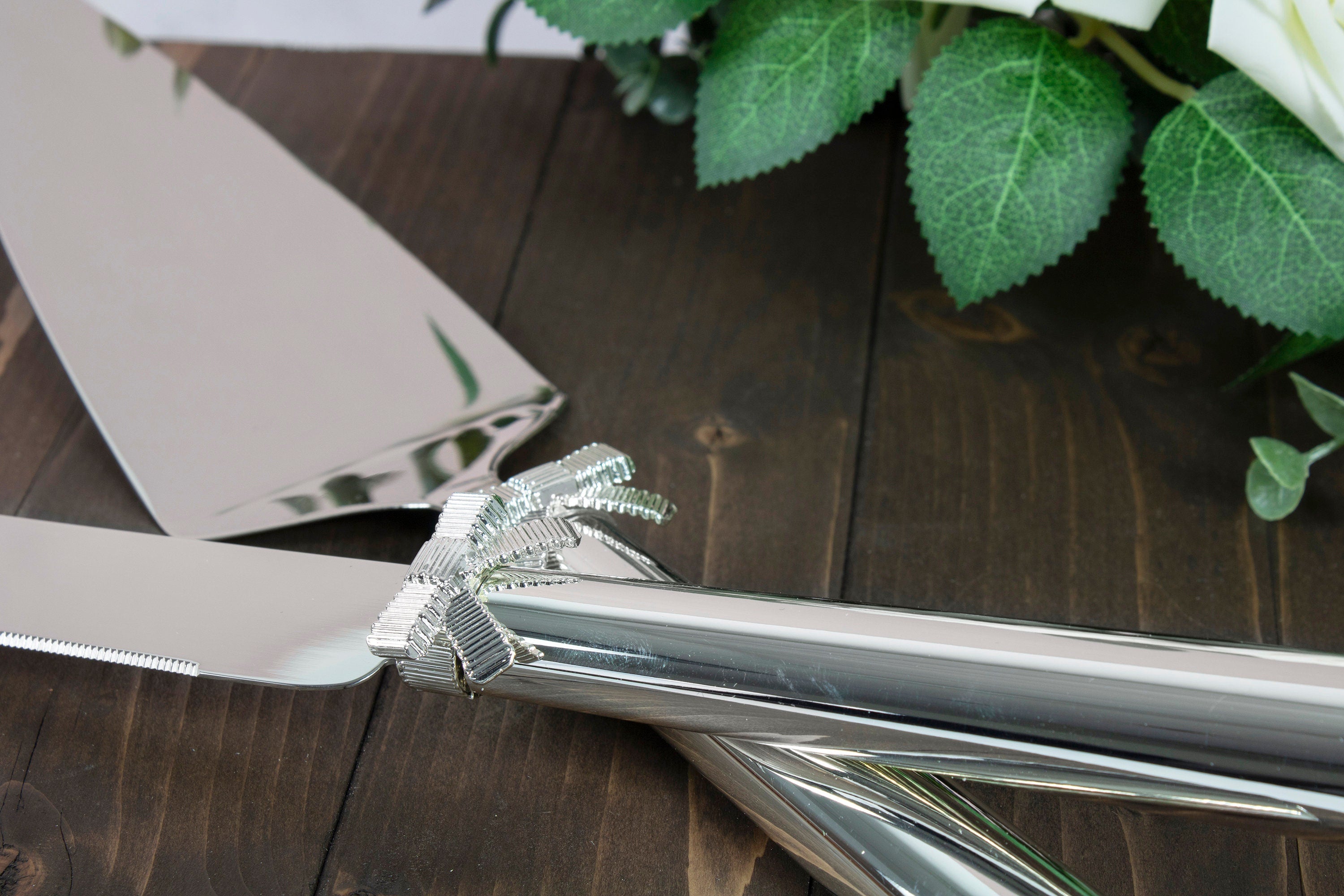 The Kate Spade New York Grace Avenue wedding cake knife and server set brings a sweet, feminine charm to your cake-cutting moment on your wedding day. Crafted from durable silver-plated metal with textured grosgrain ribbon and bow accents on the handles for a playful yet elegant touch, the knife measures 13 inches long with a serrated blade for smooth slicing, while the matching server is 12 inches - both featuring a mirror-polished finish that photographs beautifully and feels balanced as you share that tender first cut together. This set arrives in elegant Kate Spade gift packaging and is best hand washed to preserve its shine for all your anniversaries ahead.