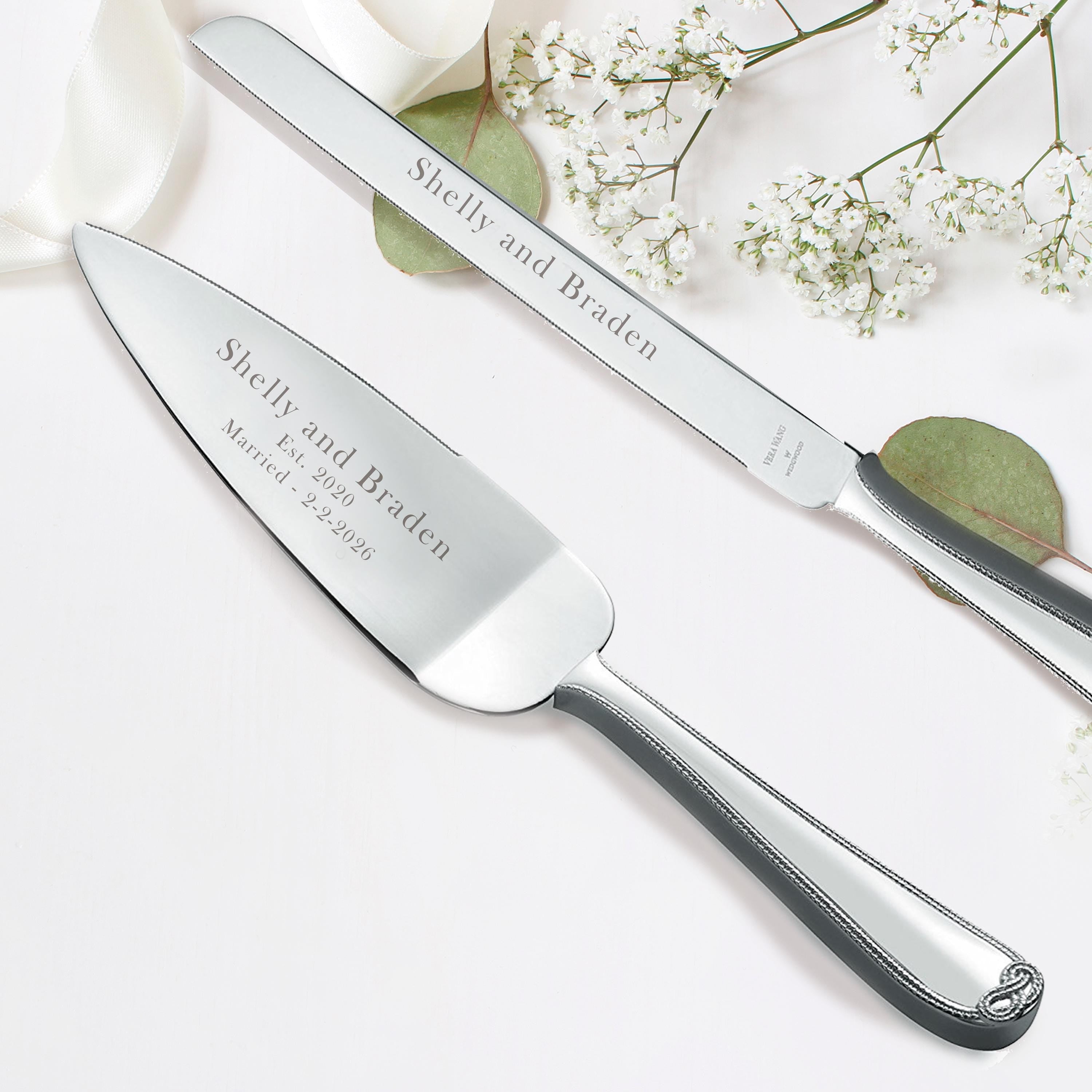 The Vera Wang Wedgwood Infinity wedding cake knife and server set brings a timeless, heartfelt symbol to your cake-cutting moment on your wedding day. Crafted from silver-plated stainless steel with the signature braided infinity rope motif on the handles representing eternal connection and commitment, the knife measures 13 inches long with a serrated blade for smooth slicing, while the matching server is 11.25 inches - both feeling substantial yet graceful as you share that tender first cut together. This set arrives in elegant Vera Wang gift packaging and is best hand washed to preserve its soft shine for all your anniversaries ahead.