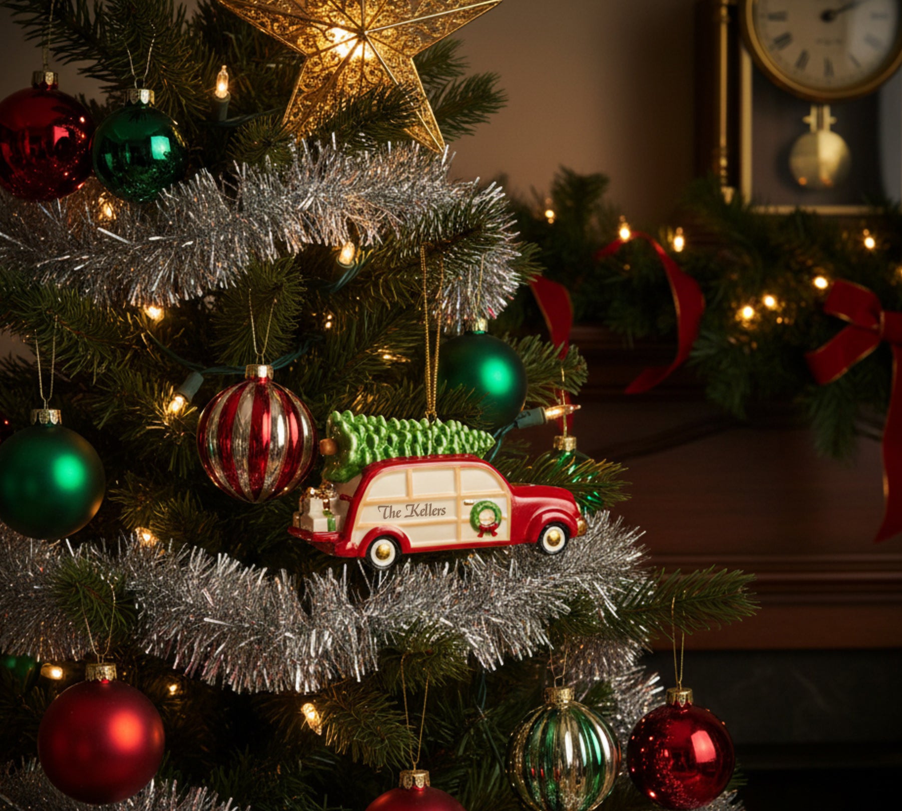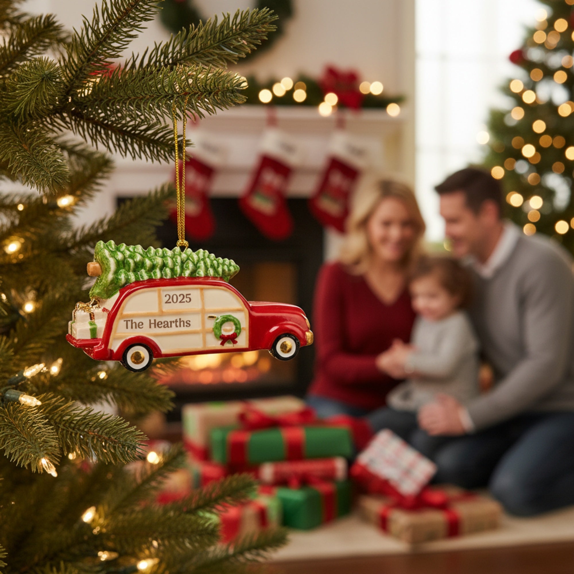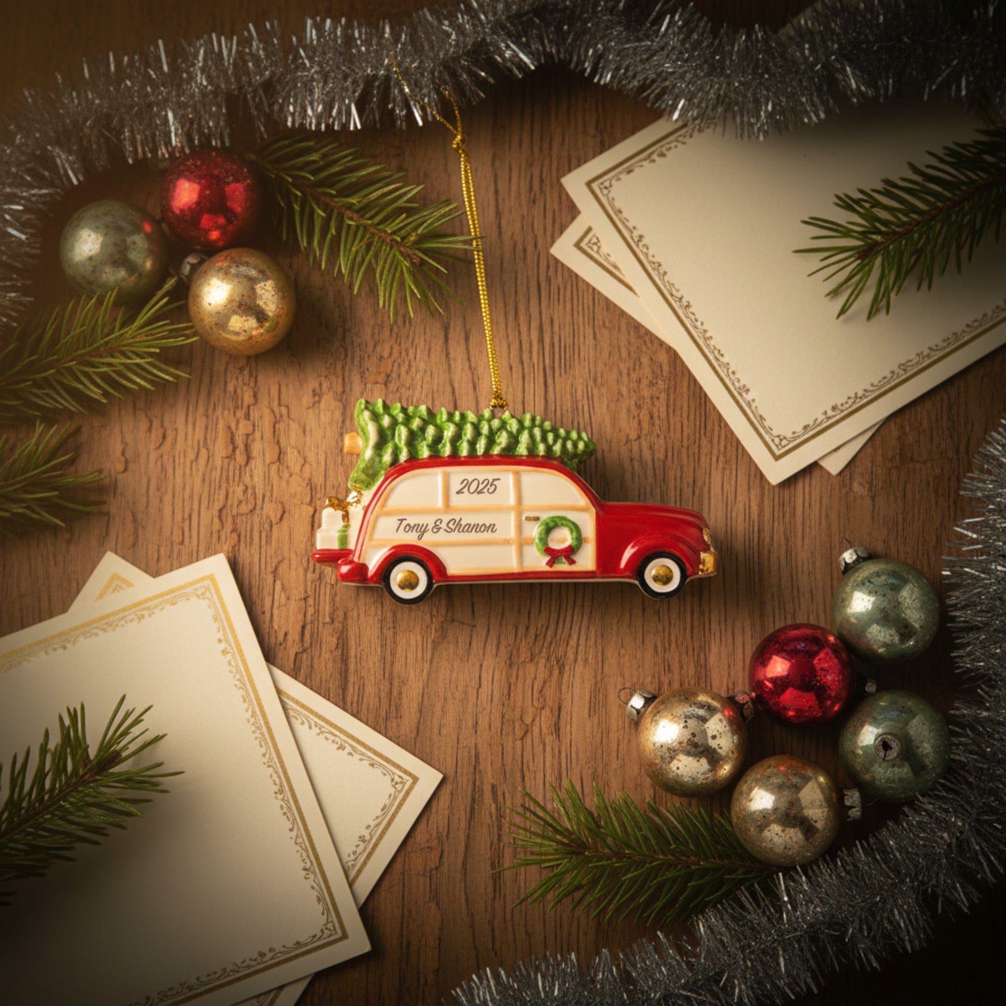 Shaped like a vintage red station wagon topped with a perfectly trimmed Christmas tree, this charming ornament captures the heart of the holiday season. It’s a fun, nostalgic piece that adds warmth and personality to any tree.