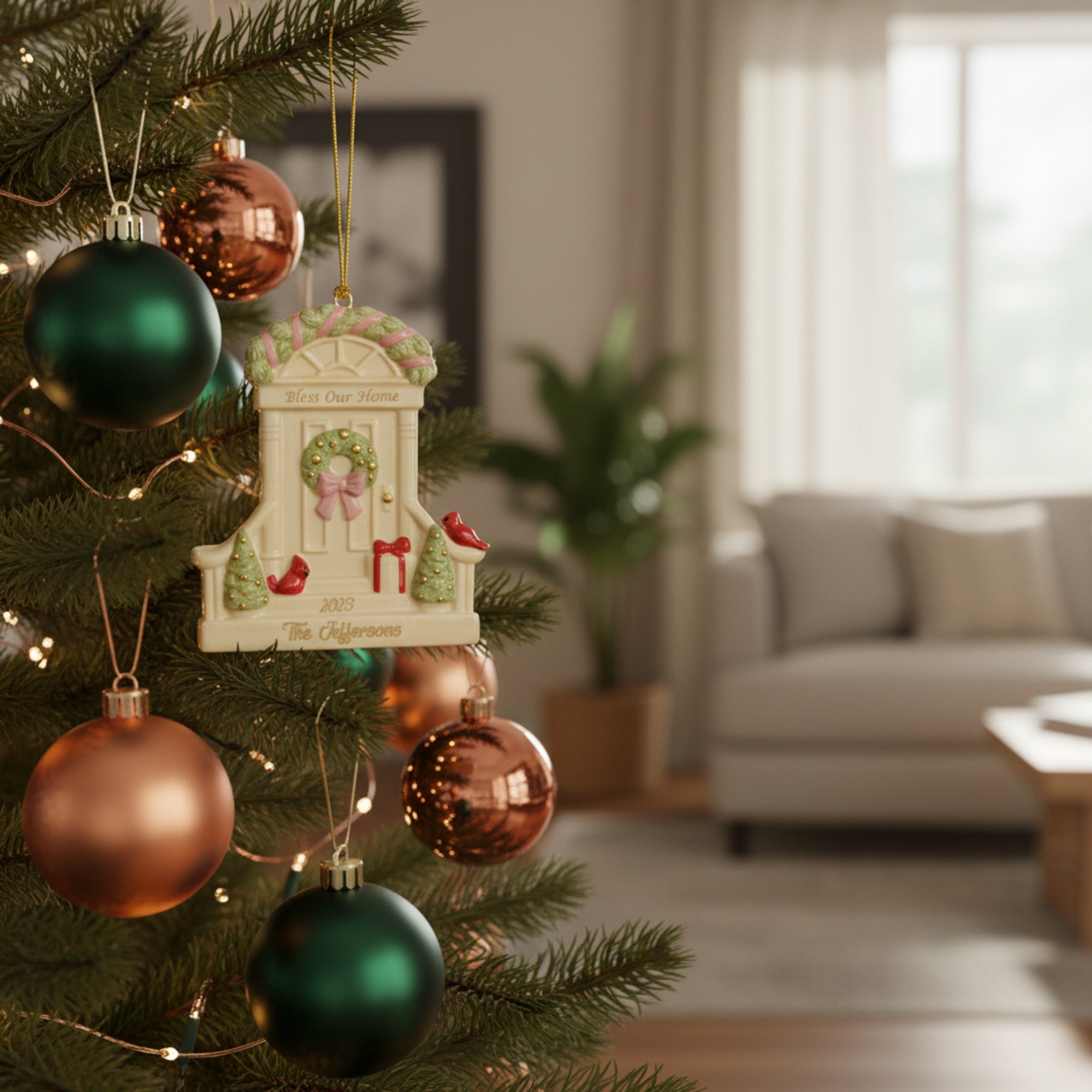 Crafted from fine ivory ceramic, this charming ornament features a front door design adorned with festive wreaths, garland, and golden accents that radiate holiday warmth. The words “Bless Our Home” are beautifully pre-engraved above the doorway, symbolizing love, gratitude, and new beginnings.
