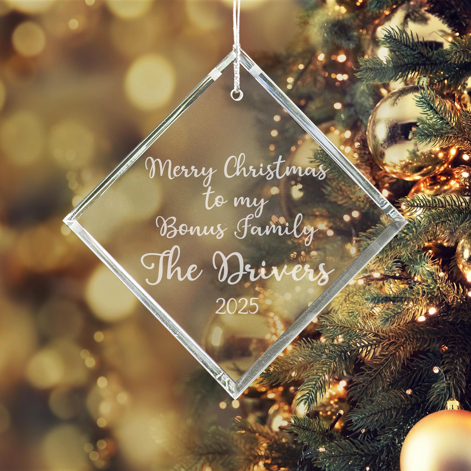Celebrate special connections with a truly luxurious Ravanox 3 inch Diamond Crystal Ornament. This exquisite clear glass ornament is custom engraved with your personalized message, making it a thoughtful gift for cherished bonus families, friends, or colleagues. Designed to shimmer on your Christmas tree, this elegant piece serves as a timeless holiday decoration and a beautiful keepsake to remember 2025.