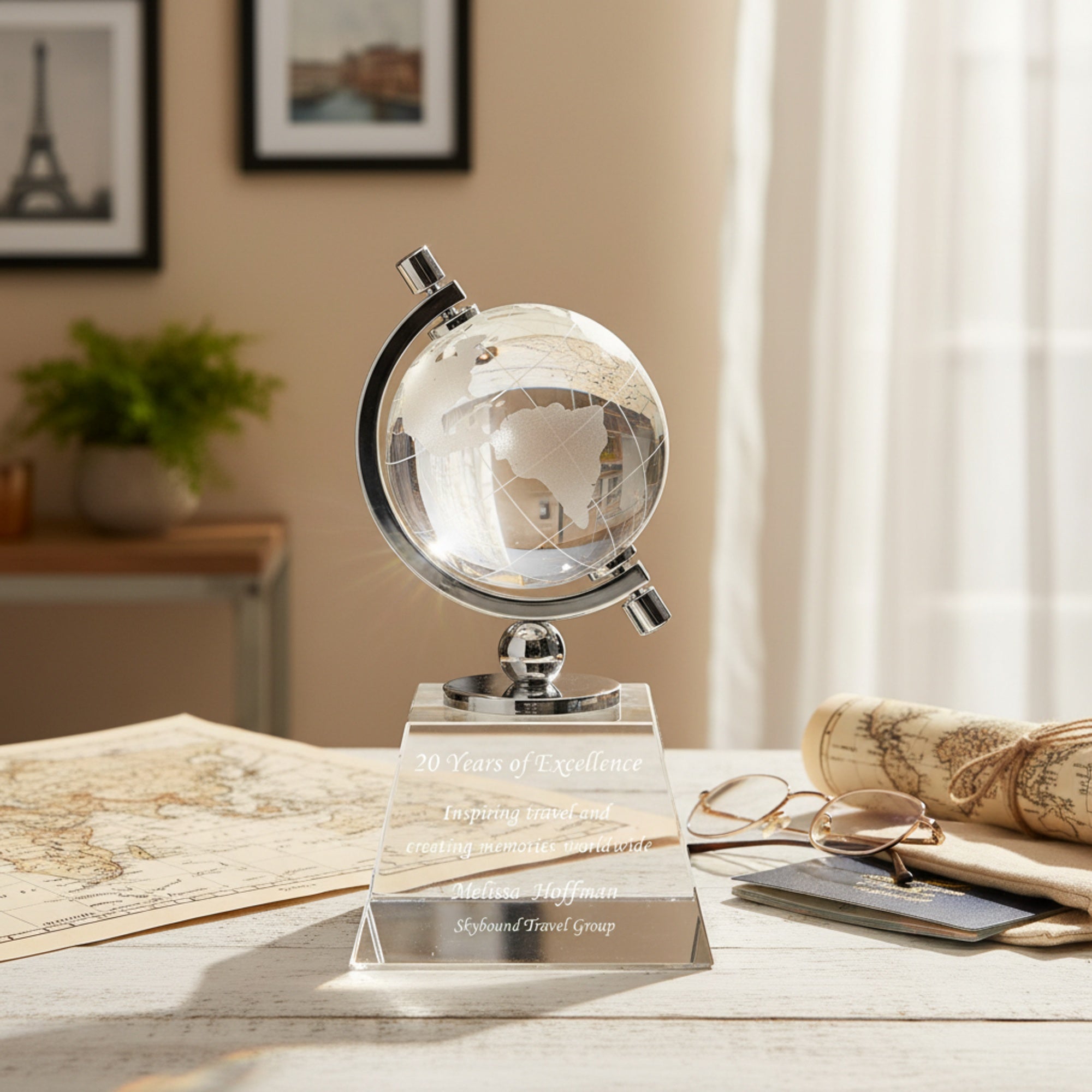 The Ravanox 6" Crystal Spinning Globe Award brings a sense of global achievement and quiet elegance to recognizing outstanding contributions, long service, or leadership milestones. Crafted from fine optic crystal with a perfectly clear globe that rotates smoothly within a polished chrome-finished stand and rests on a solid crystal base, this distinctive piece measures 6 inches tall by 3 inches wide - the gentle spin inviting reflection on accomplishments while adding a refined presence to any desk or shelf. It arrives ready for display, making it a thoughtful emblem of recognition.