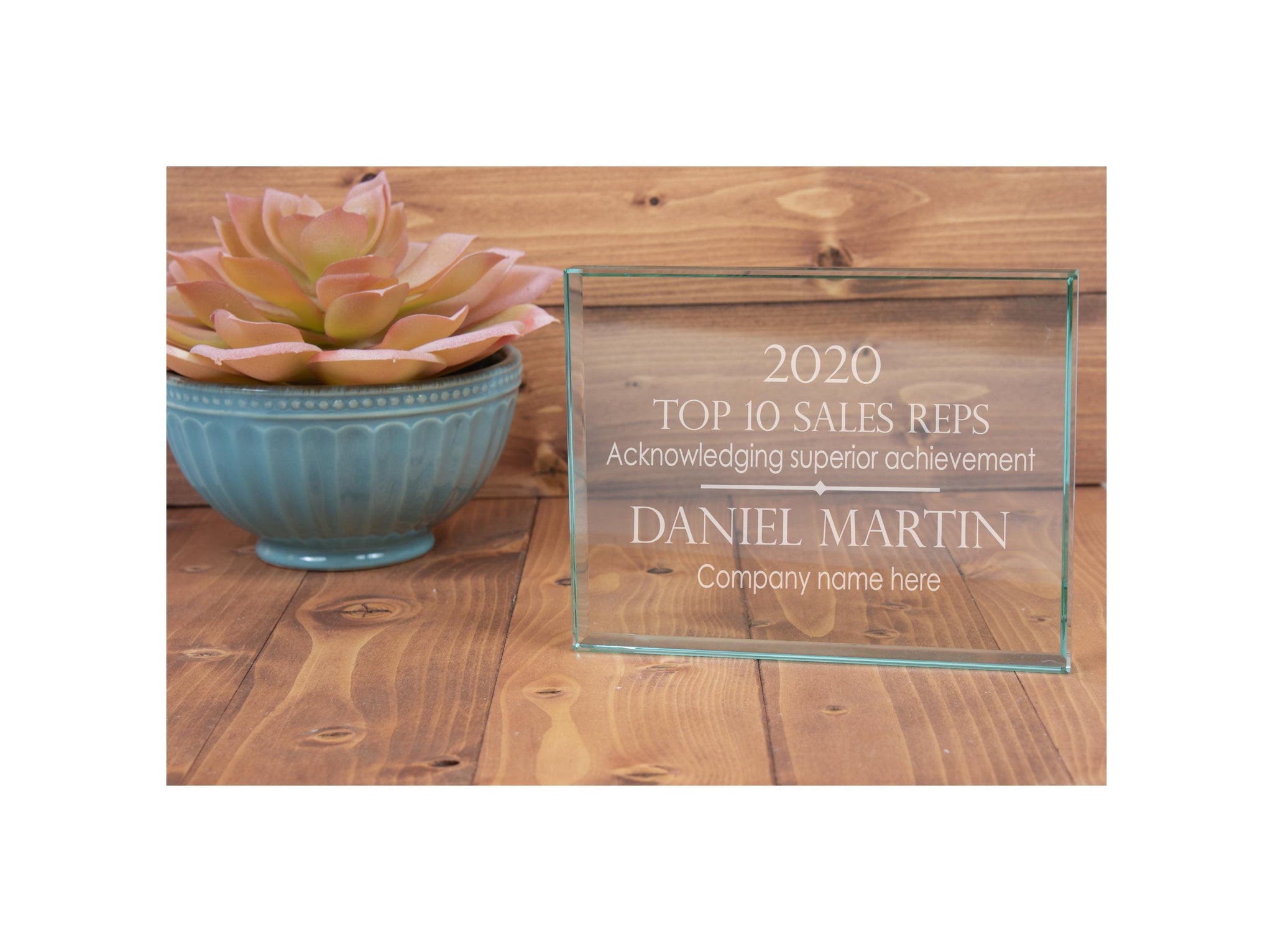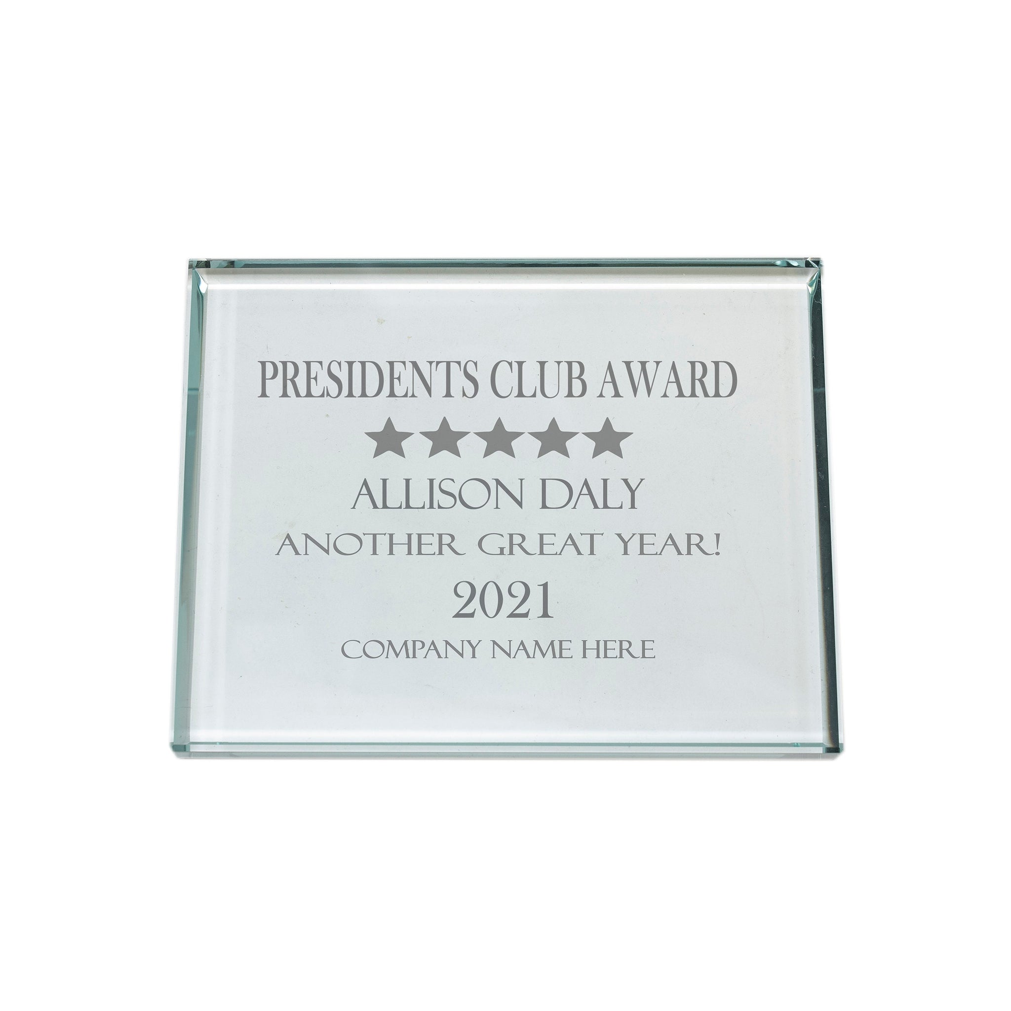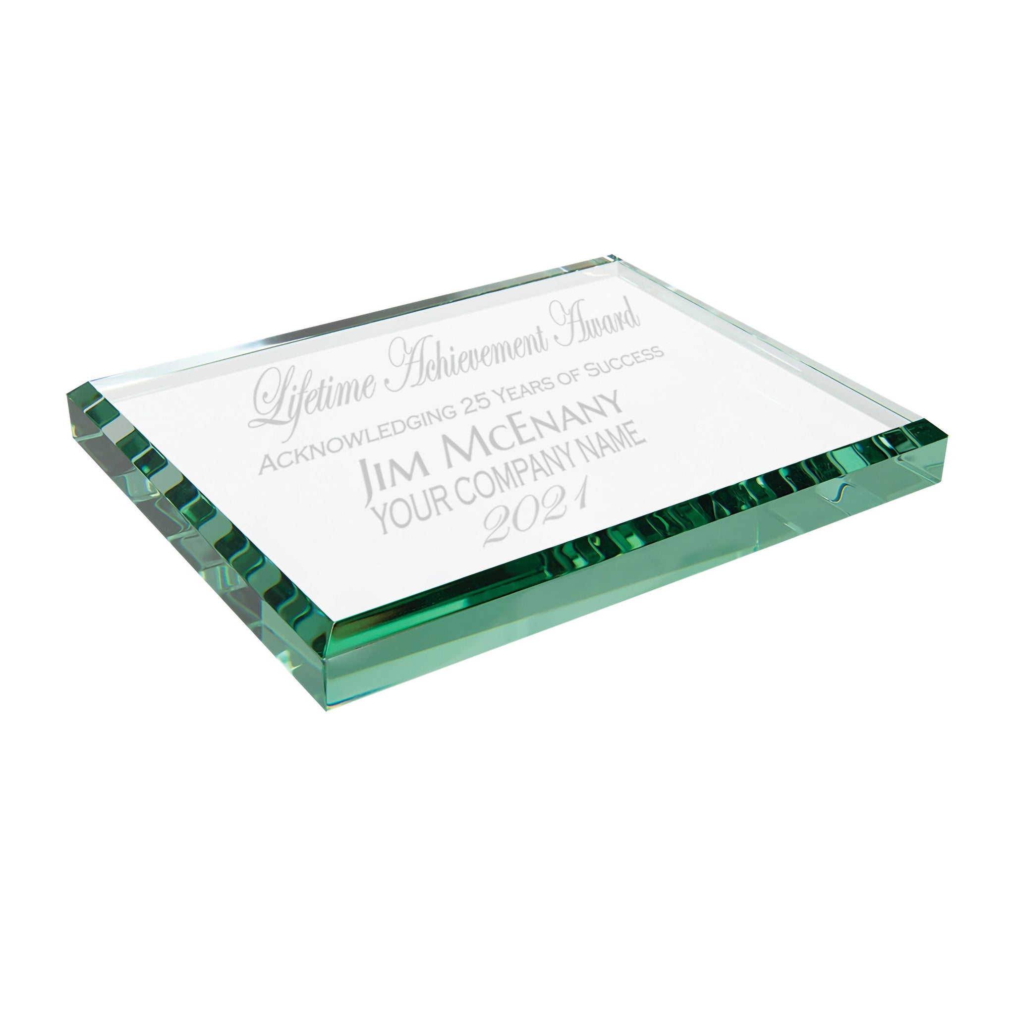 The jade glass tint, beveled edges, and personalized engraving combine to create a refined recognition piece that is both decorative and practical.