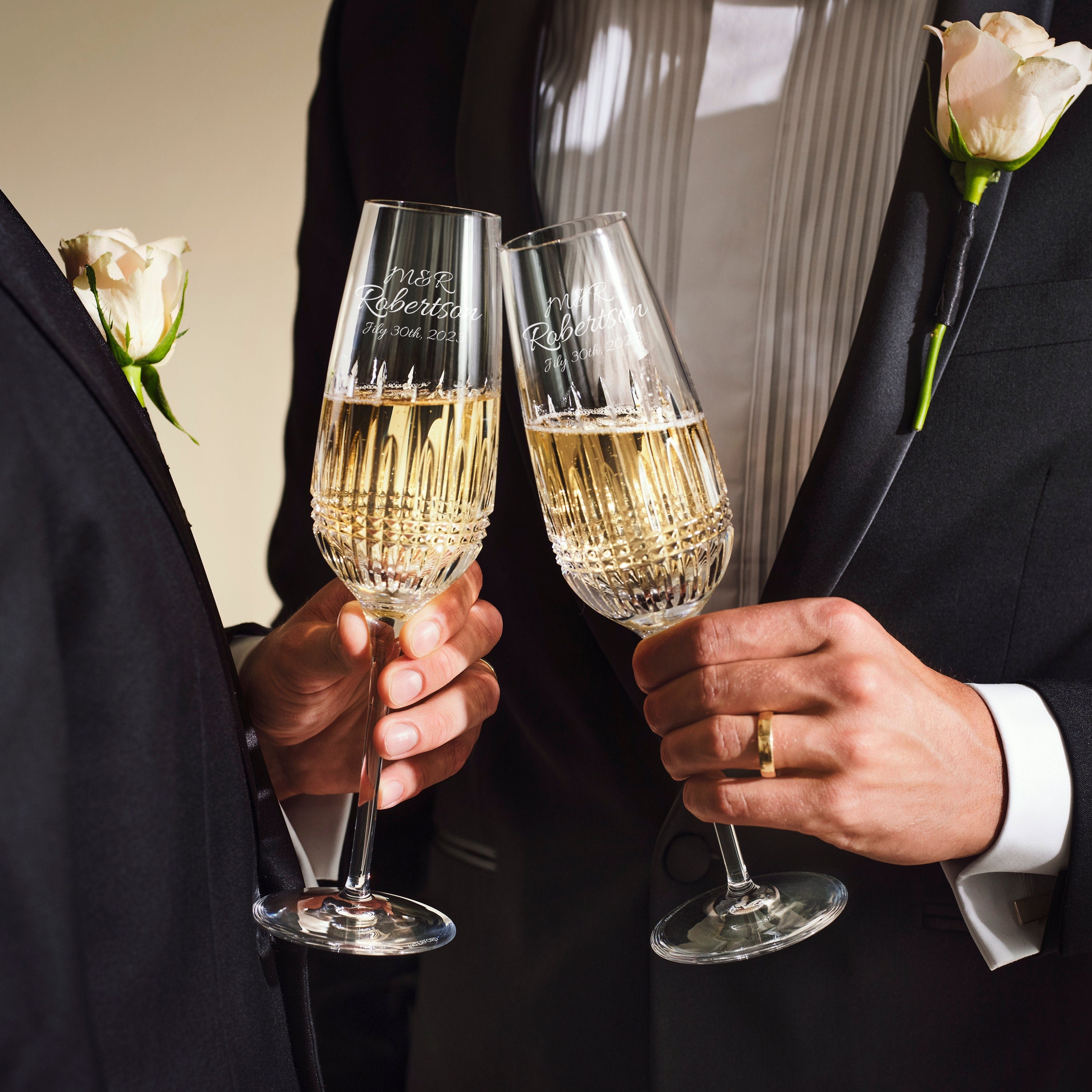 Make these glasses even more meaningful with our custom engraving. Add names, dates, a special message, or monogram to create a personalized and engraved gift that's perfect for weddings, anniversaries, engagements, or bridal showers. The engraving adds your heartfelt touch to the crystal surface, blending Waterford's modern diamond pattern with luxurious flutes for lifelong milestone toasts.