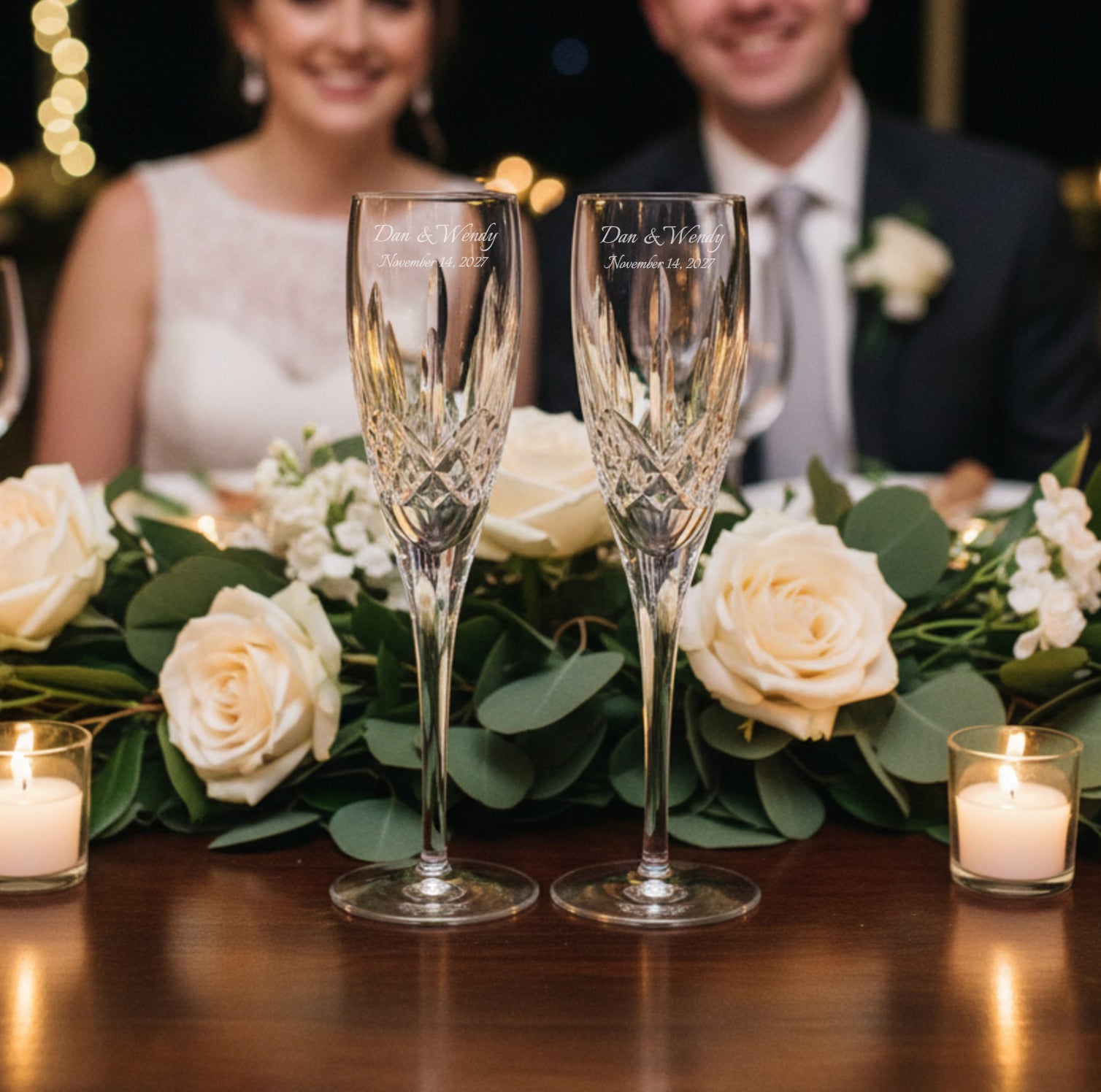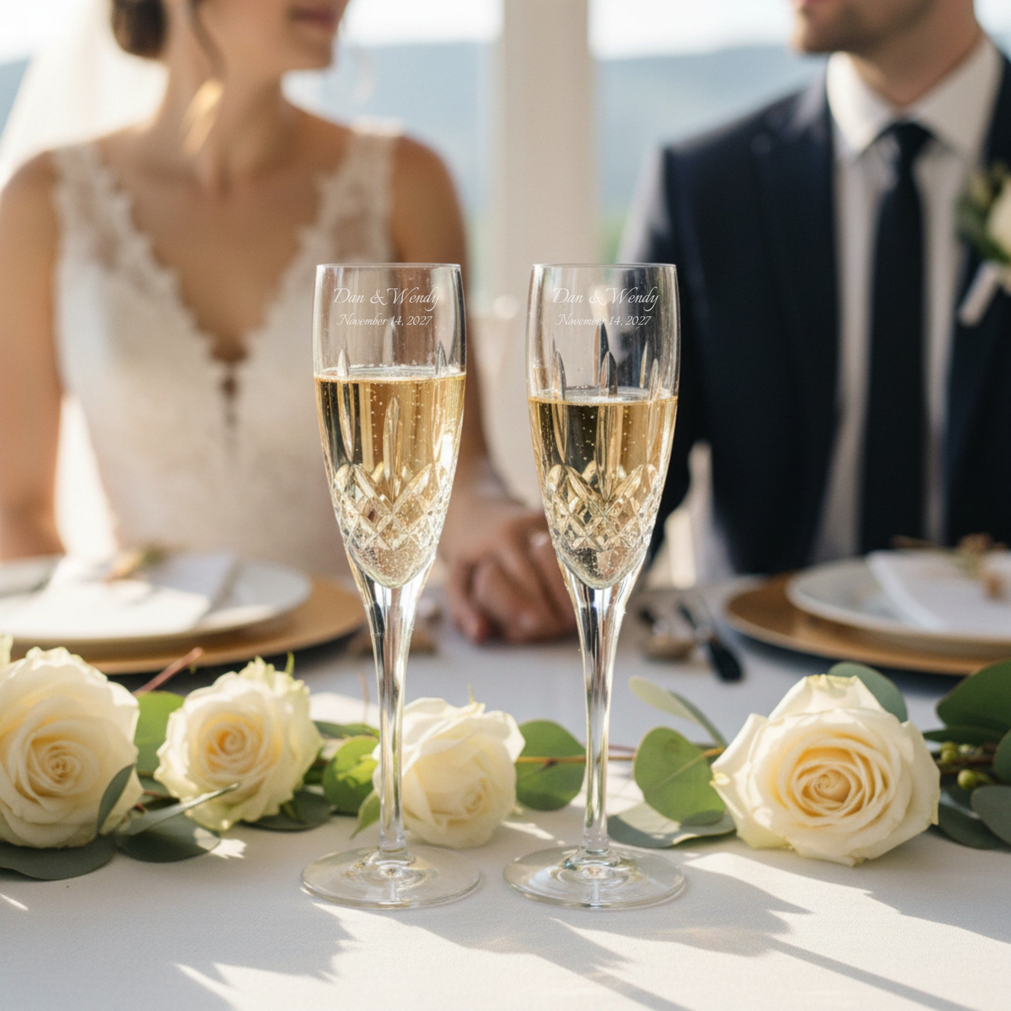 Make these flutes truly yours with our custom engraving service. We tailor the engraving especially to your wedding - add your names, your wedding date, a special message, or monogram to create a deeply personal keepsake that reflects the quiet beauty of your commitment. It's a gentle, thoughtful way to turn this refined set into something you'll treasure deeply, a soft reminder of your big day each time you raise a glass to your shared future.