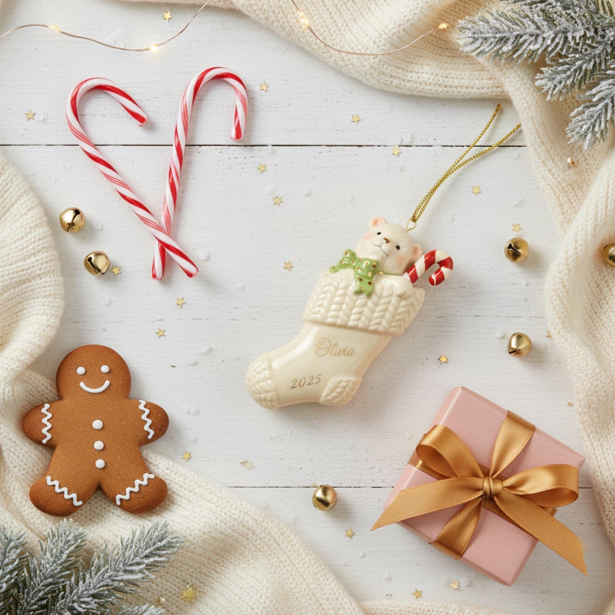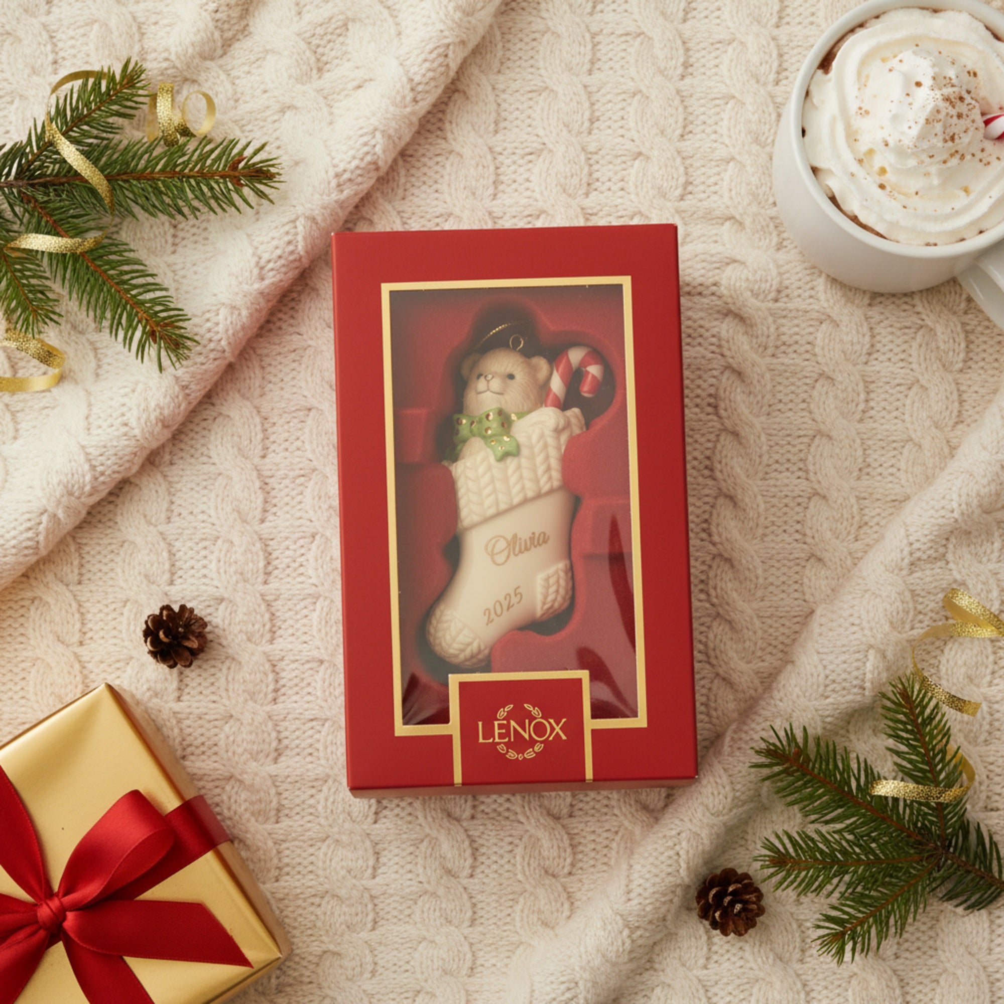 Crafted from creamy porcelain, this ornament features a textured stocking design accented with hand-painted holiday colors and elegant gold trim. Its timeless look pairs beautifully with any Christmas tree, while still feeling fun and festive for little ones year after year.